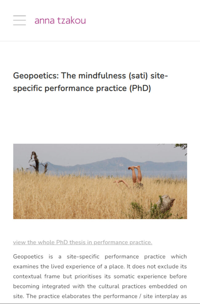 She is interested in performance scores of physicality and emotional edginess; investigating place as performance site and testing the performance act as social and political event. Anna holds a PhD in Performance Practice entitled: Geopoetics, a mindfulness (sati) site-specific performance practice, from the University of Exeter (UK), where she integrates principles of Buddhism and Geography with American and European methods of post-modern theatre in order to structure a body-landscape performance practice methodology.