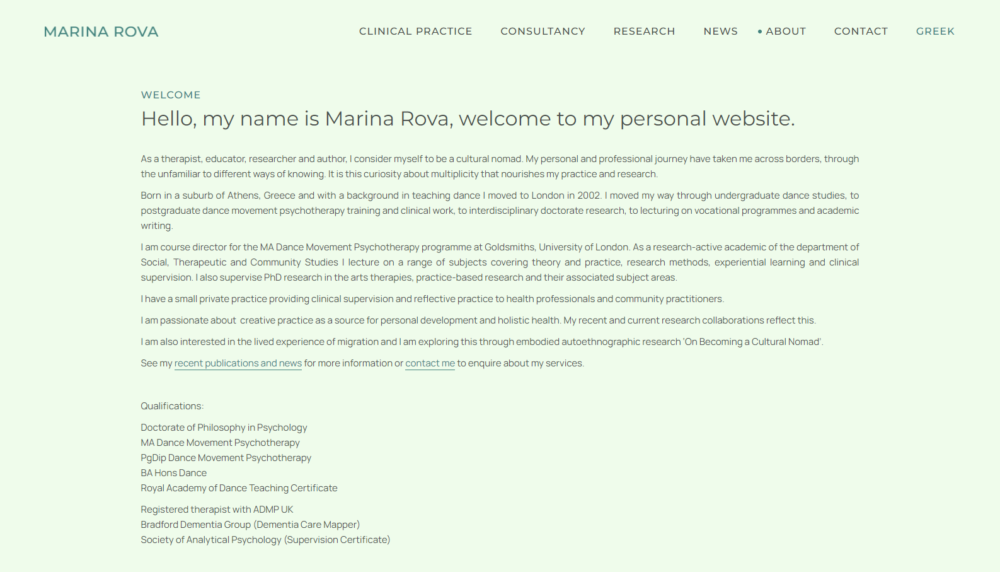 “As a therapist, educator, researcher and author, I consider myself to be a cultural nomad. My personal and professional journey have taken me across borders, through the unfamiliar to different ways of knowing. It is this curiosity about multiplicity that nourishes my practice and research.”