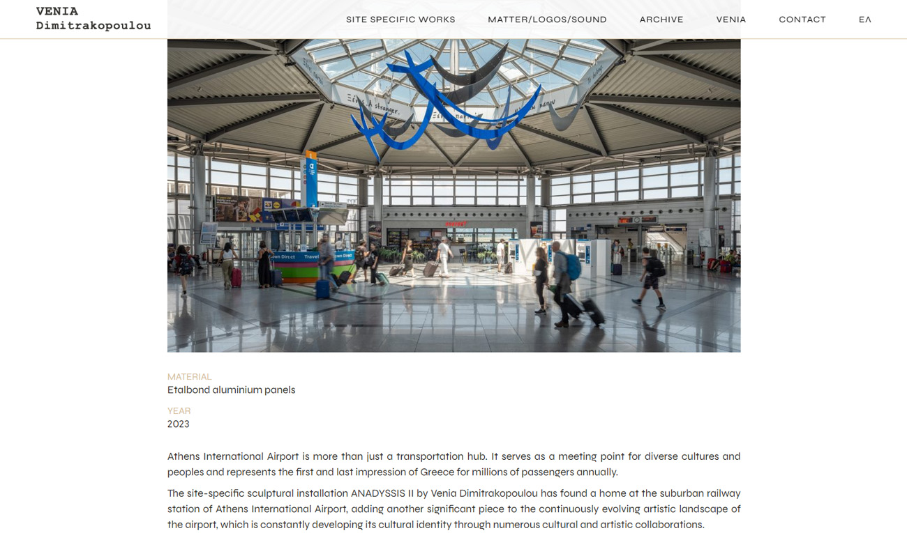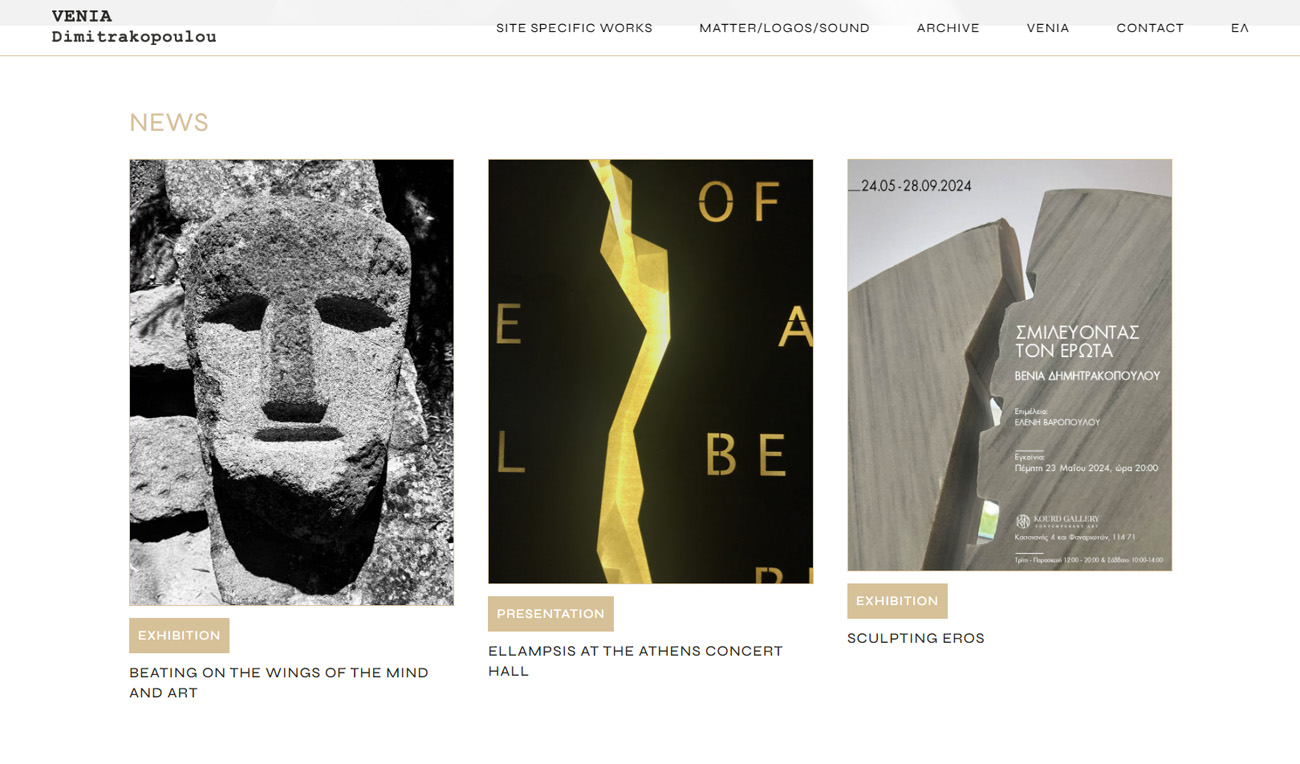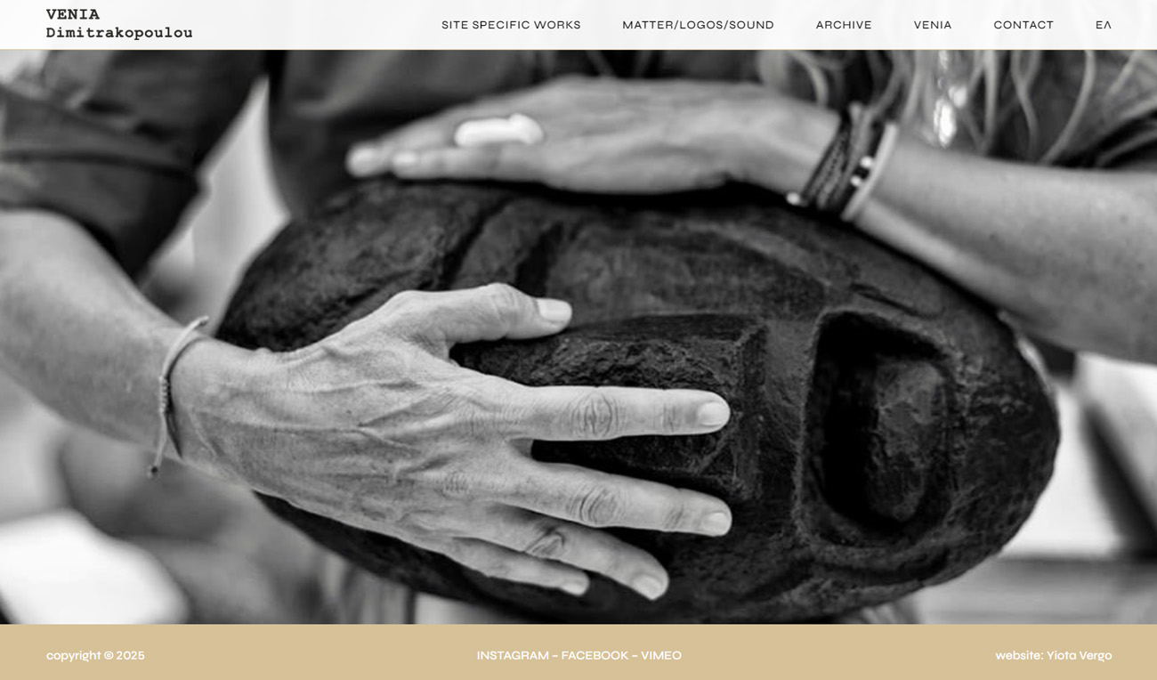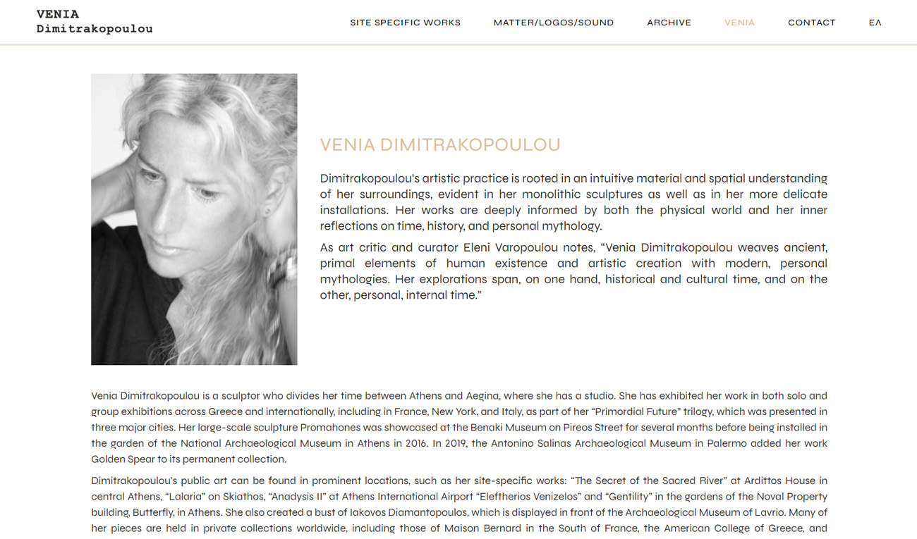 Venia Dimitrakopoulou is a sculptor who divides her time between Athens and Aegina, where she has a studio. She has exhibited her work in both solo and group exhibitions across Greece and internationally, including in France, New York, and Italy, as part of her “Primordial Future” trilogy, which was presented in three major cities. Her large-scale sculpture Promahones was showcased at the Benaki Museum on Pireos Street for several months before being installed in the garden of the National Archaeological Museum in Athens in 2016. In 2019, the Antonino Salinas Archaeological Museum in Palermo added her work Golden Spear to its permanent collection.