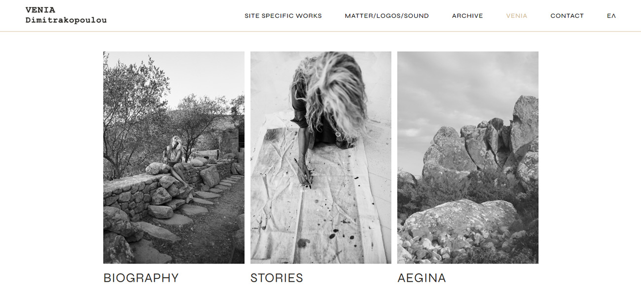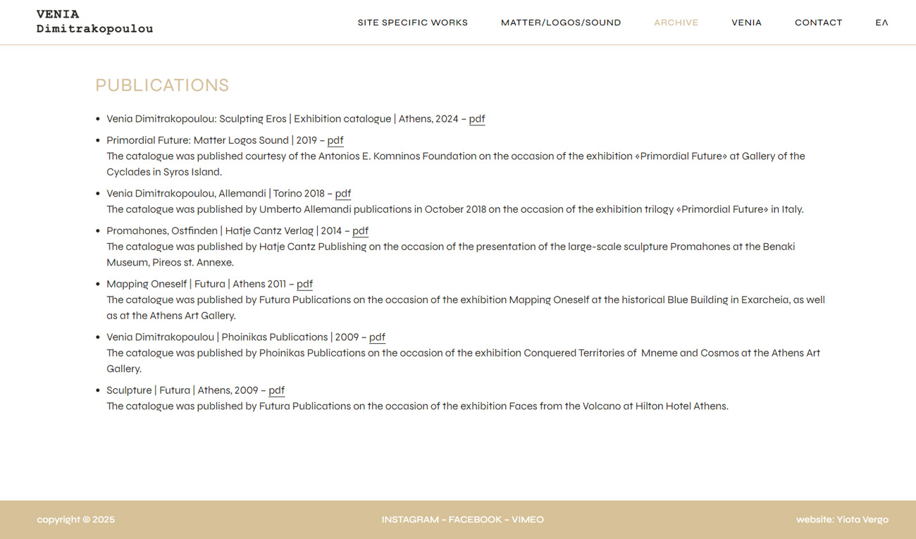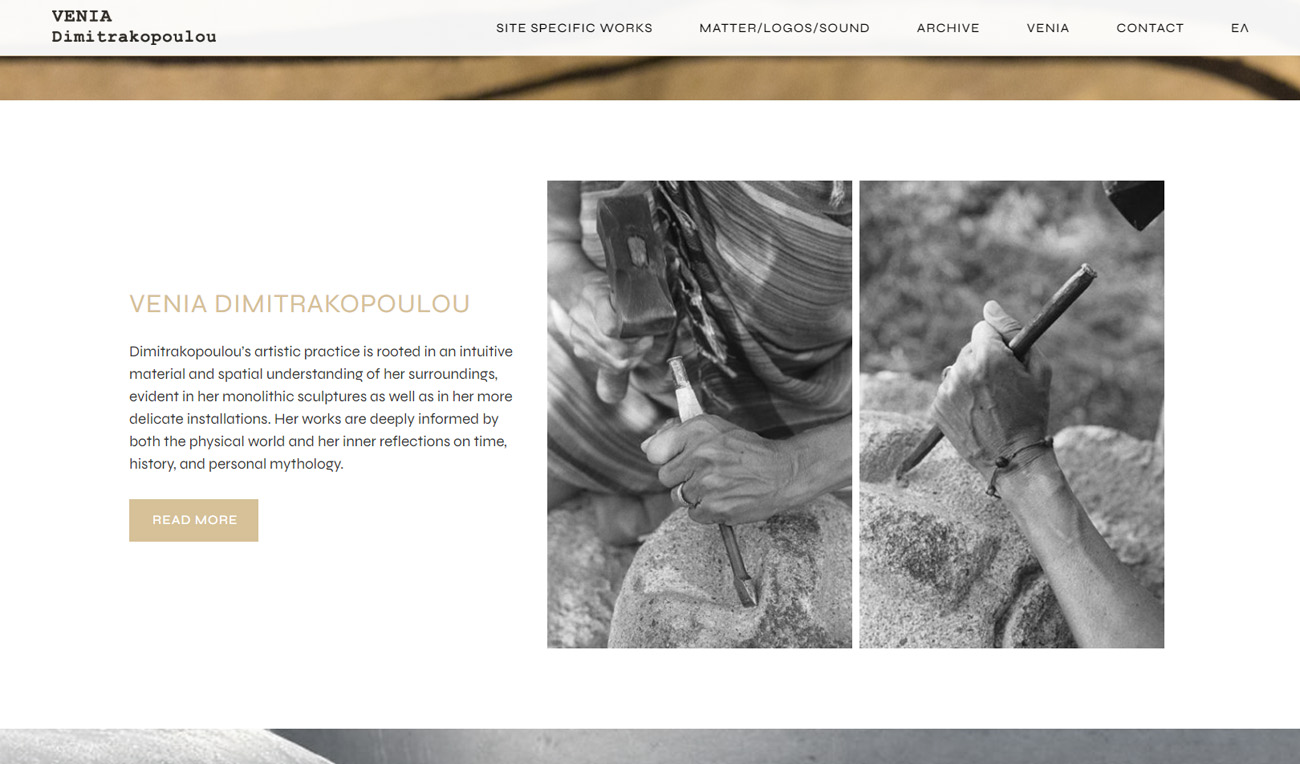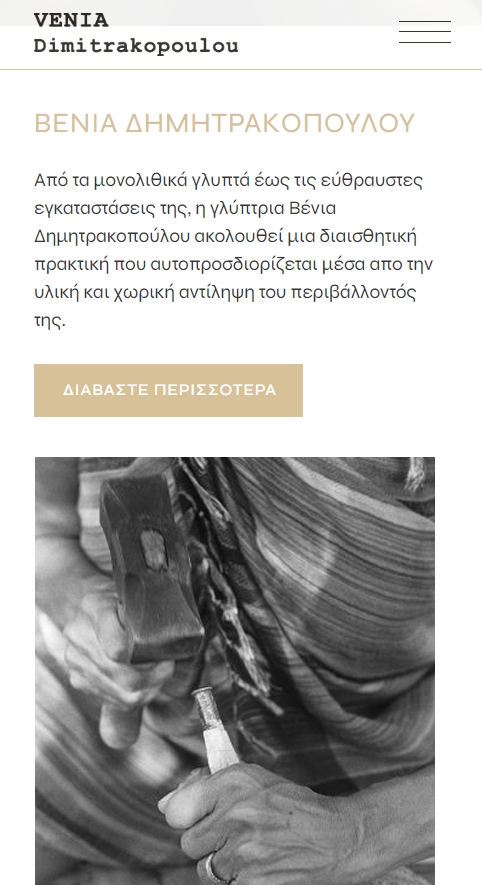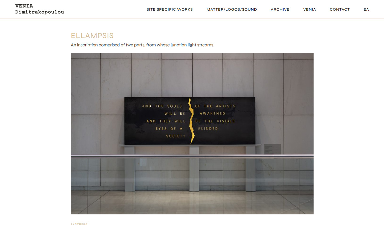 Venia Dimitrakopoulou is a sculptor who divides her time between Athens and Aegina, where she has a studio. She has exhibited her work in both solo and group exhibitions across Greece and internationally, including in France, New York, and Italy, as part of her “Primordial Future” trilogy, which was presented in three major cities. Her large-scale sculpture Promahones was showcased at the Benaki Museum on Pireos Street for several months before being installed in the garden of the National Archaeological Museum in Athens in 2016. In 2019, the Antonino Salinas Archaeological Museum in Palermo added her work Golden Spear to its permanent collection.
