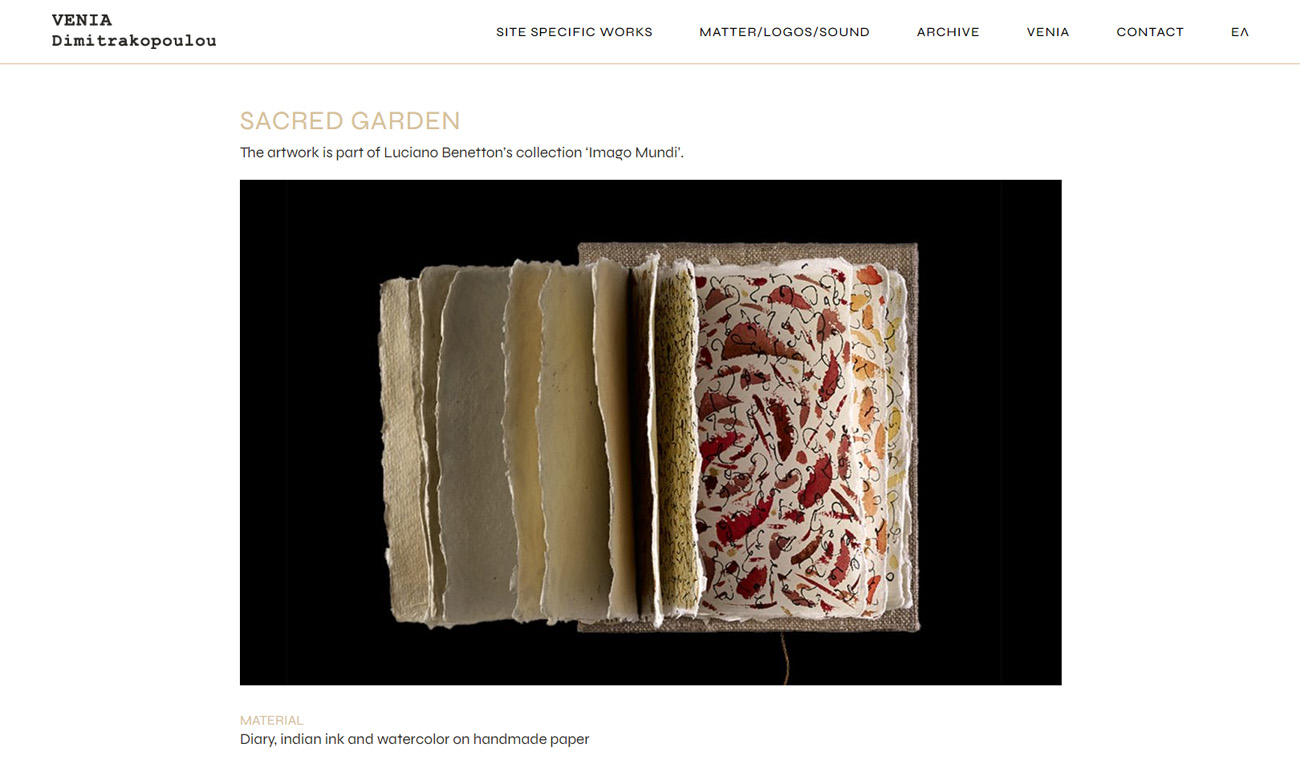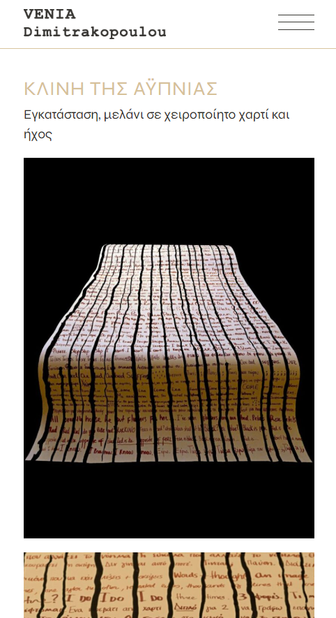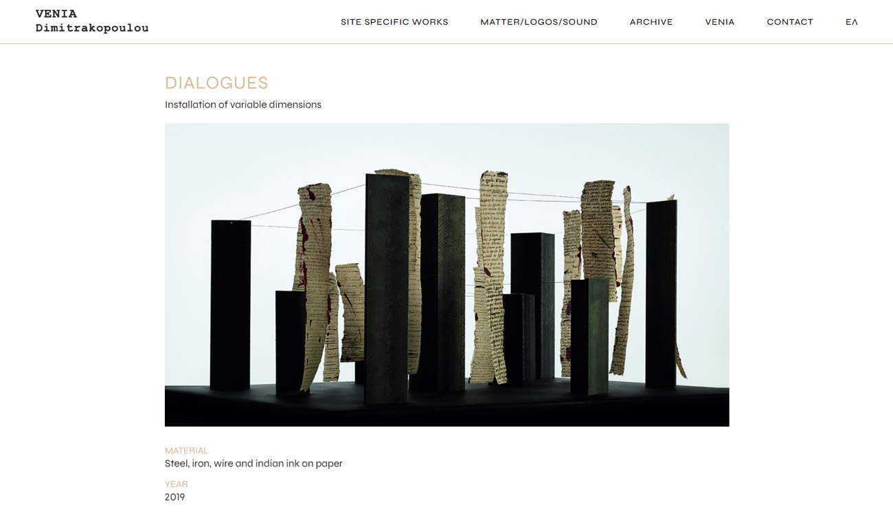 Dimitrakopoulou’s artistic practice is rooted in an intuitive material and spatial understanding of her surroundings, evident in her monolithic sculptures as well as in her more delicate installations. Her works are deeply informed by both the physical world and her inner reflections on time, history, and personal mythology. As art critic and curator Eleni Varopoulou notes, “Venia Dimitrakopoulou weaves ancient, primal elements of human existence and artistic creation with modern, personal mythologies. Her explorations span, on one hand, historical and cultural time, and on the other, personal, internal time.”